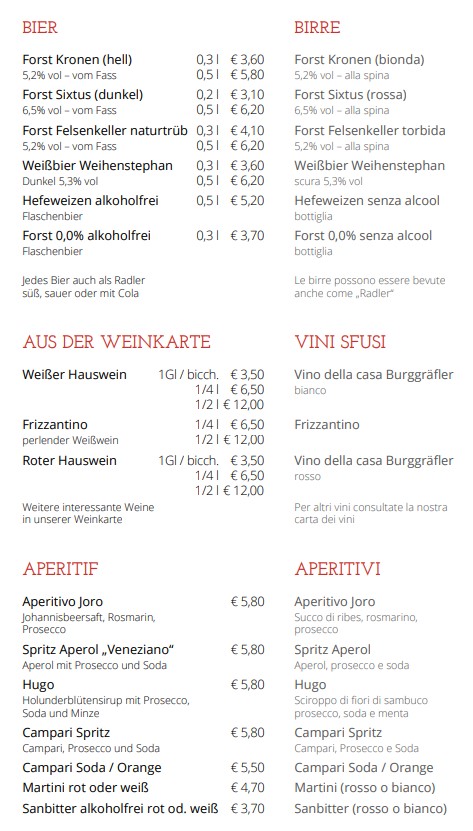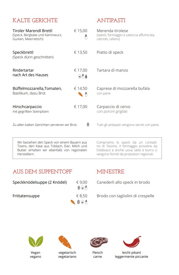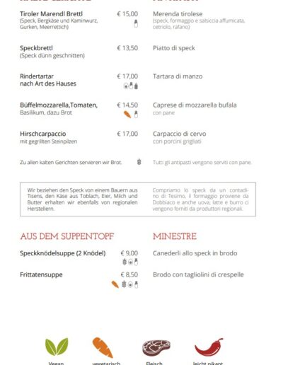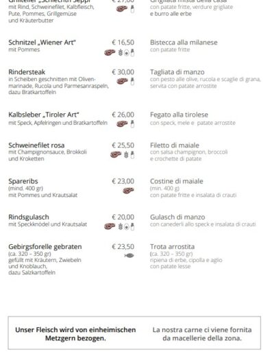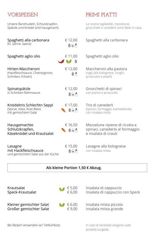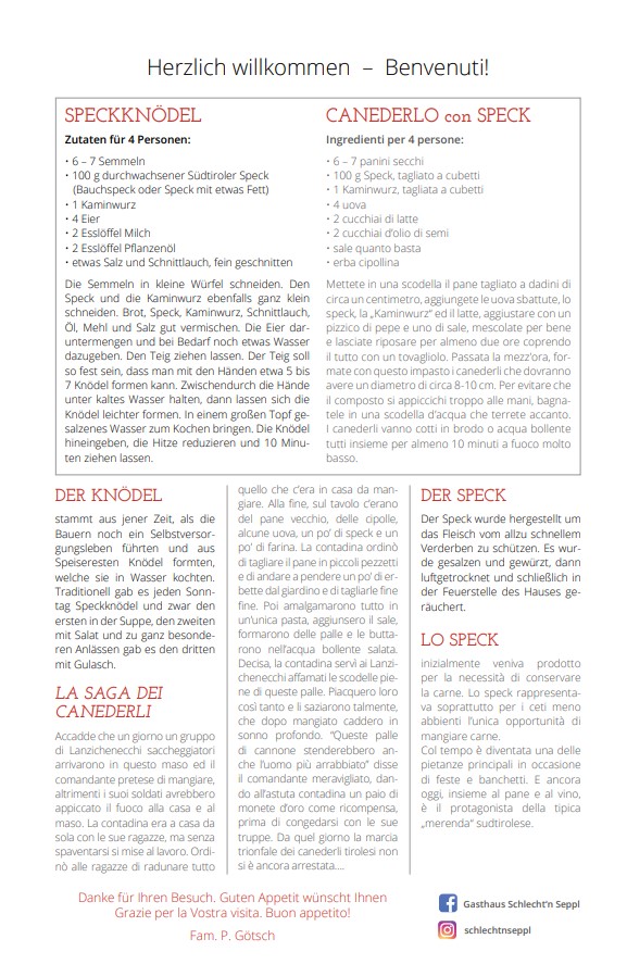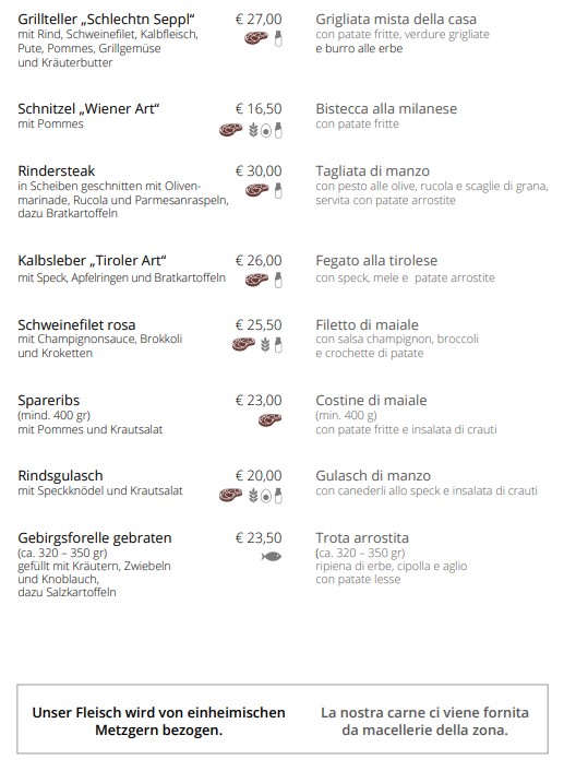 Il ristorante Schlecht’n Seppl è parte integrante di Tirolo da generazioni. Fondata nel 1923, la nostra struttura è sinonimo di tradizione e qualità. La nostra filosofia è offrire ai nostri ospiti non solo cibo delizioso, ma anche una sensazione di casa e comfort. Ogni piatto è preparato con ingredienti freschi e regionali per preservare il gusto autentico della cucina tirolese.